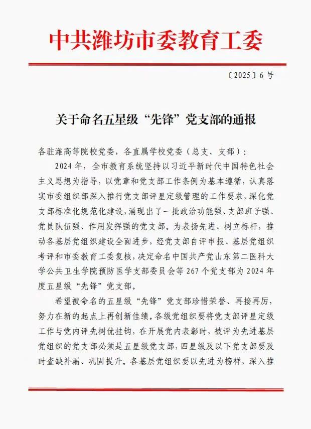 近日,中共潍坊市委教育工委发布的《关于命名五星级“先锋”党支部的通报》中,太阳成集团122ccvip教师党支部脱颖而出,被正式命名为2024年度五星级“先锋”党支部 。这一荣誉的取得,是公司党建工作的重大成果,更是全体教师党员共同努力的结晶。